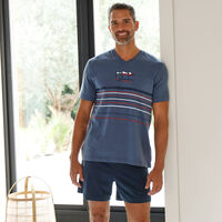 Pyjama short col V coton adouci (bleu grisé / marine)