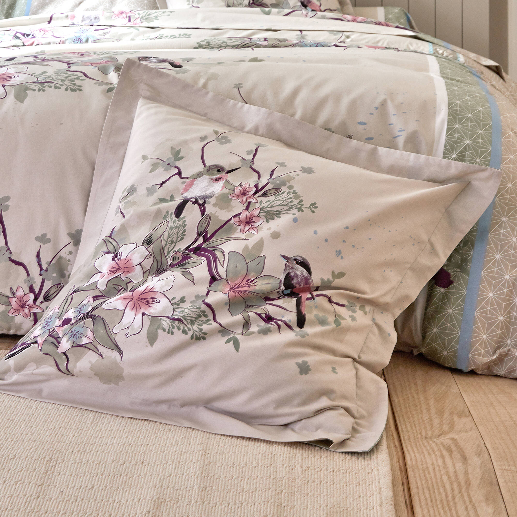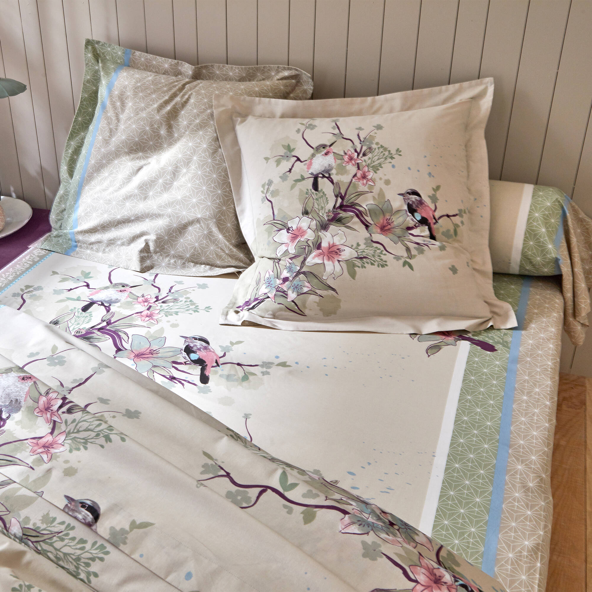 Linge de lit Birdy en coton imprimé oiseaux (sable)
