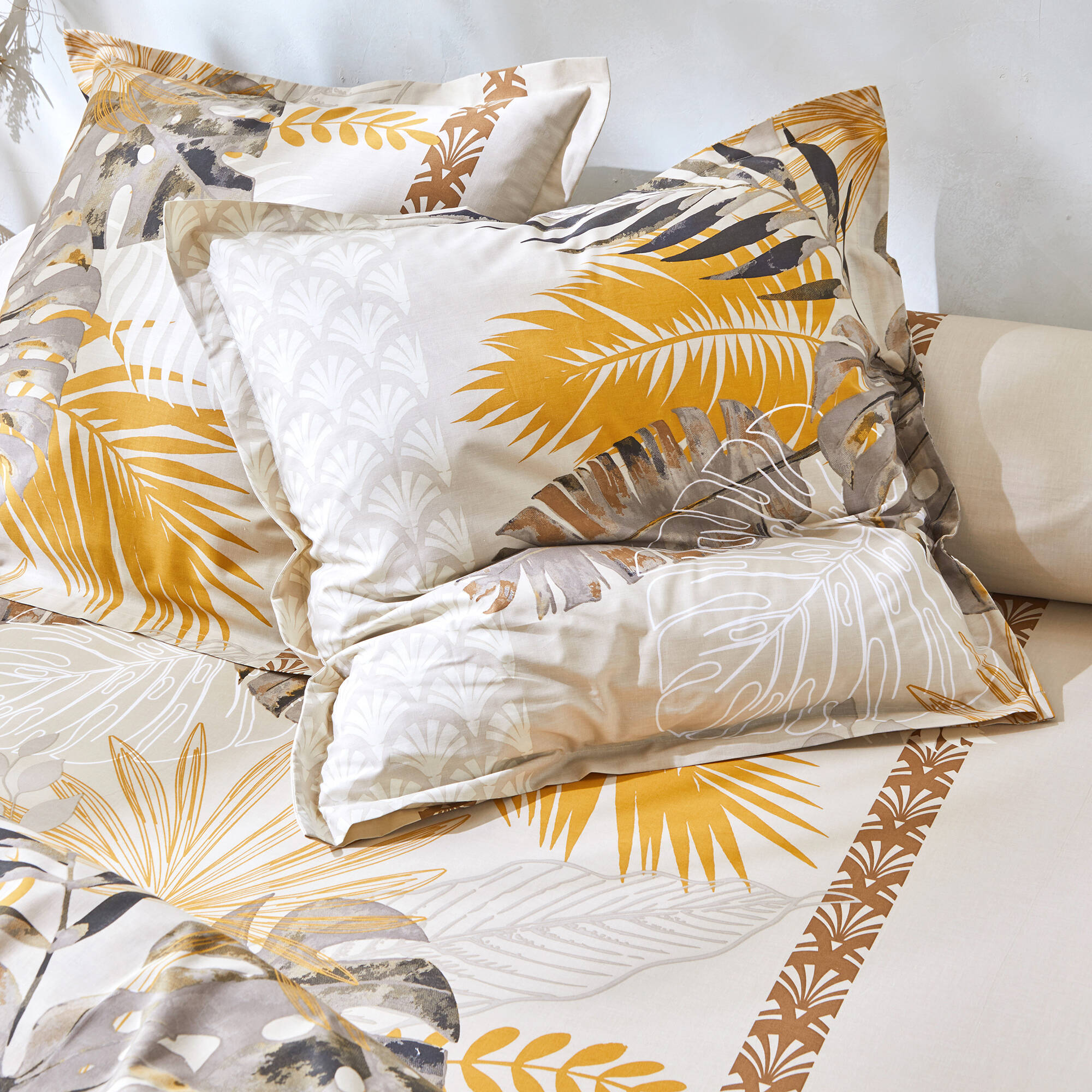 Linge de lit Cayenne en coton imprimé feuilles de palmiers (beige)