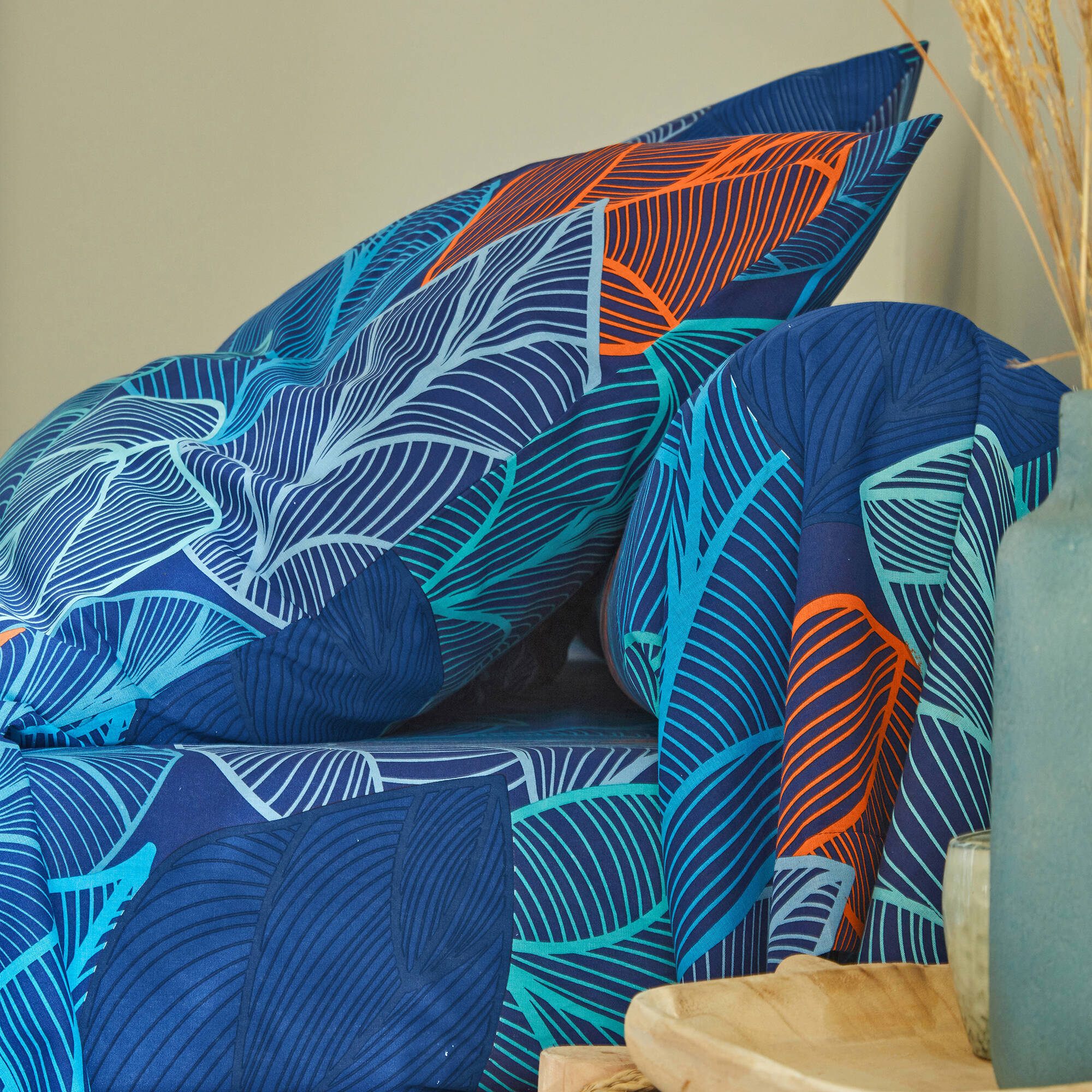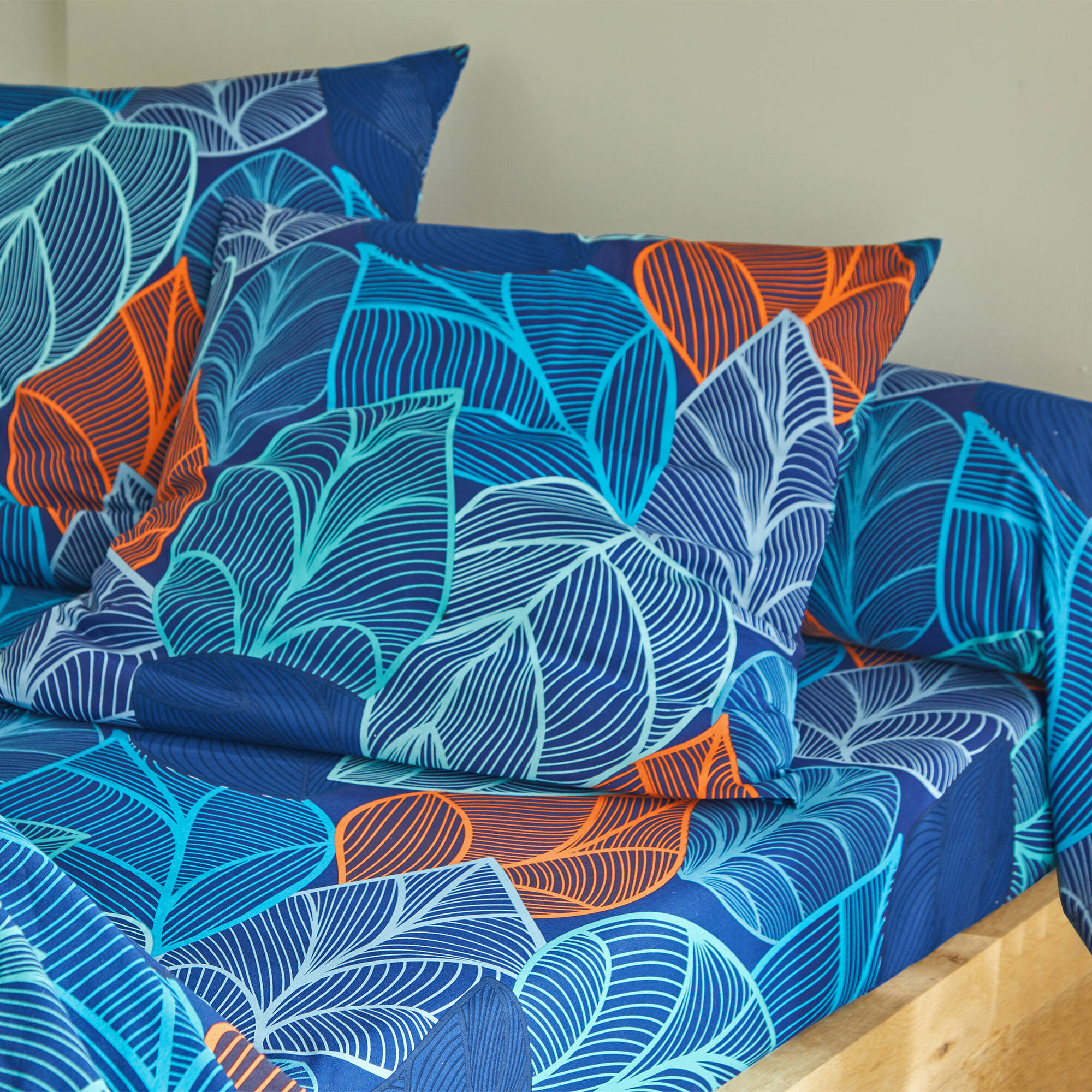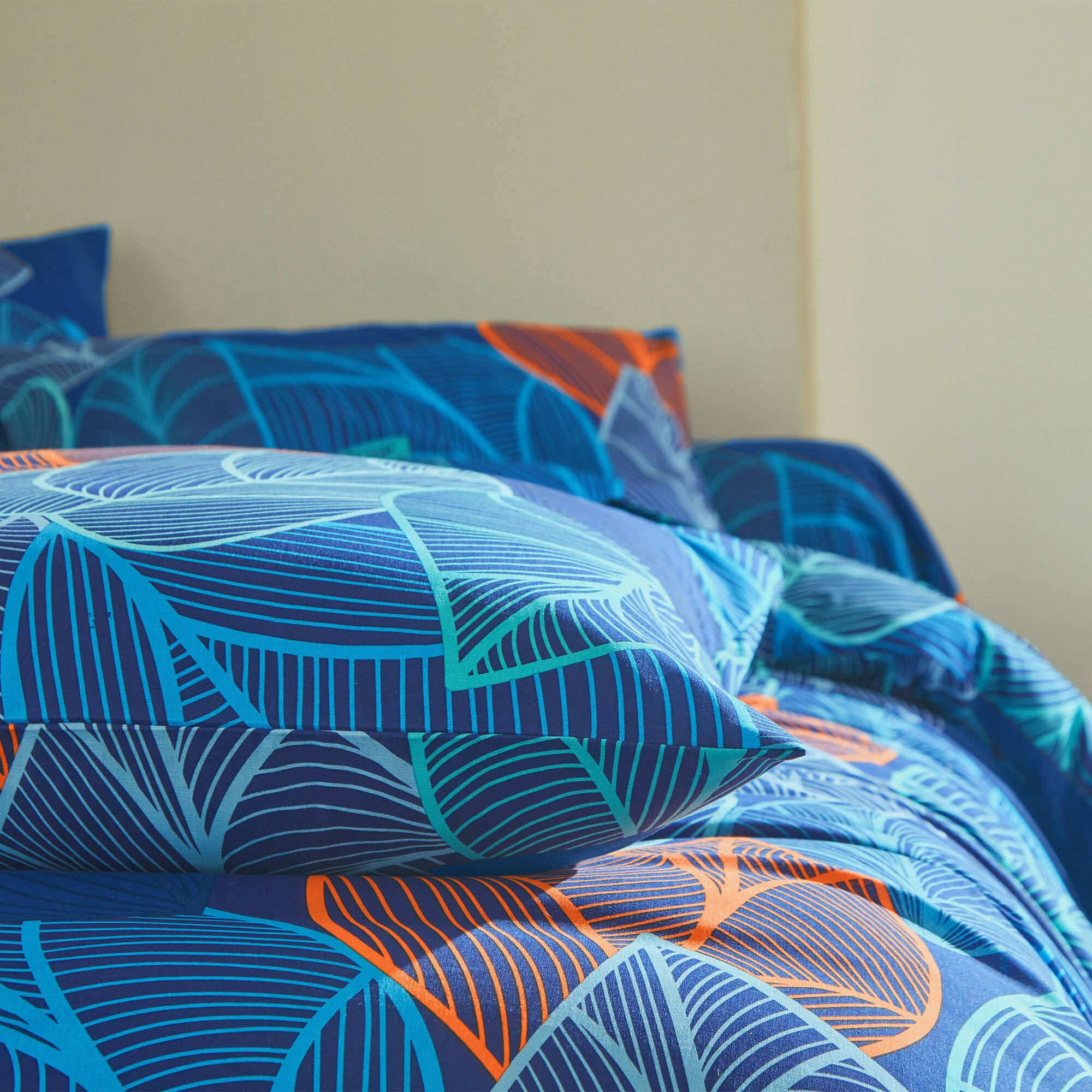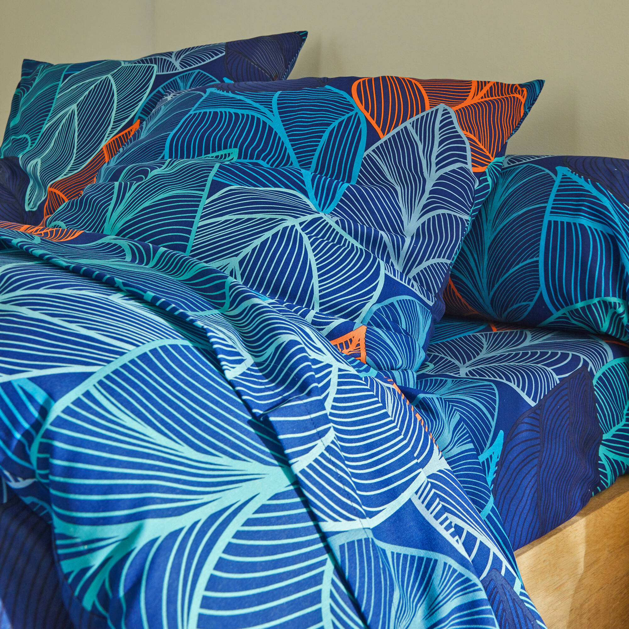 Linge de lit Elsa en polycoton à motifs feuilles (bleu)
