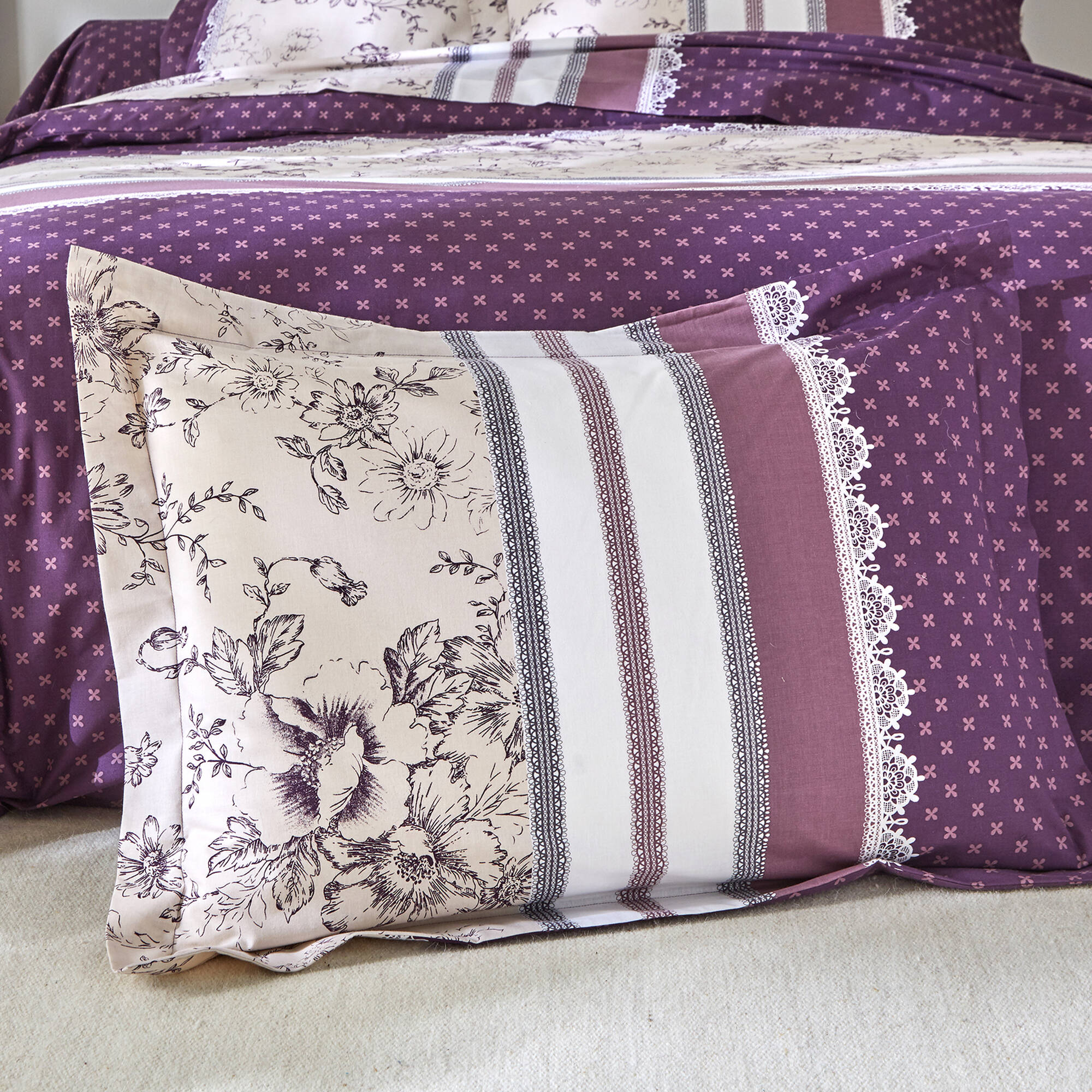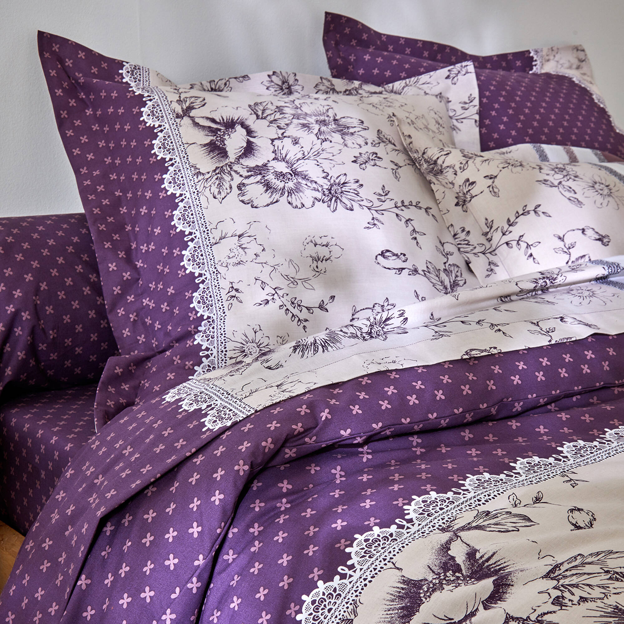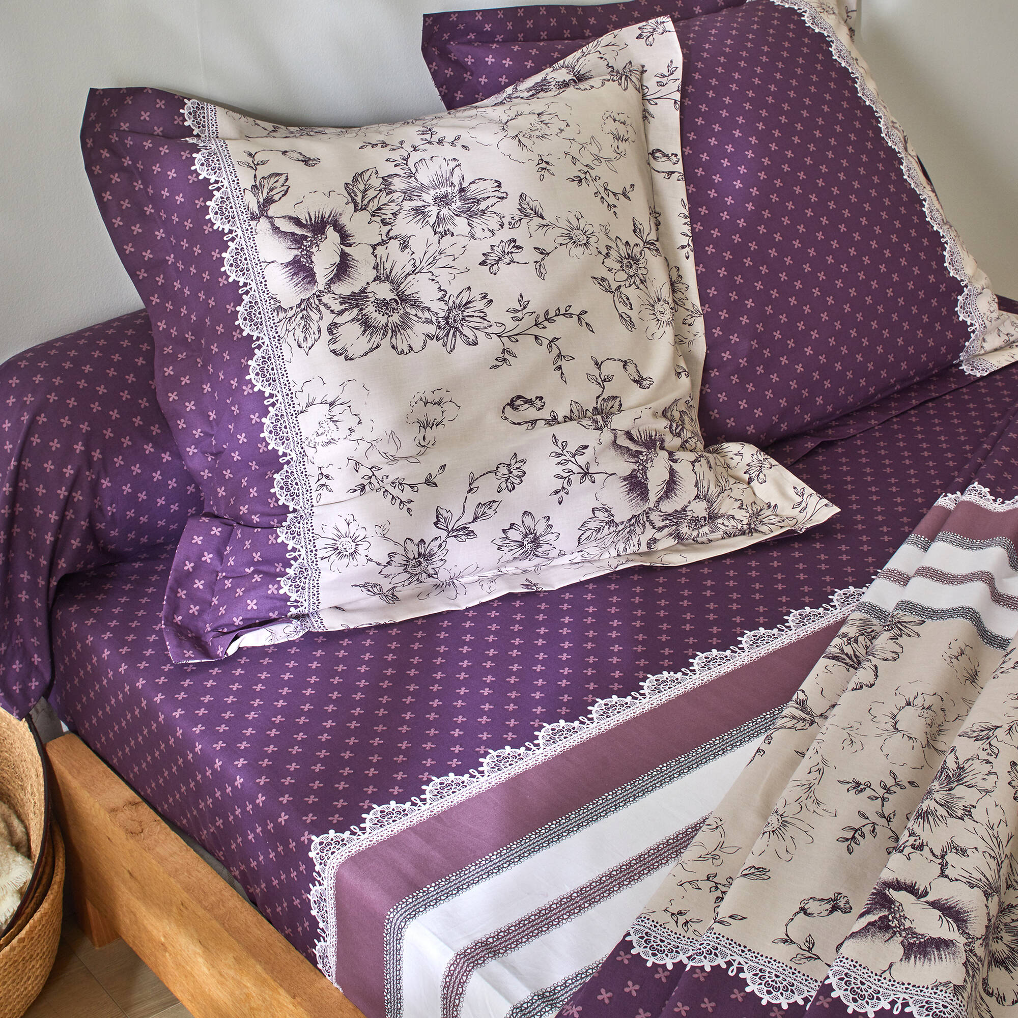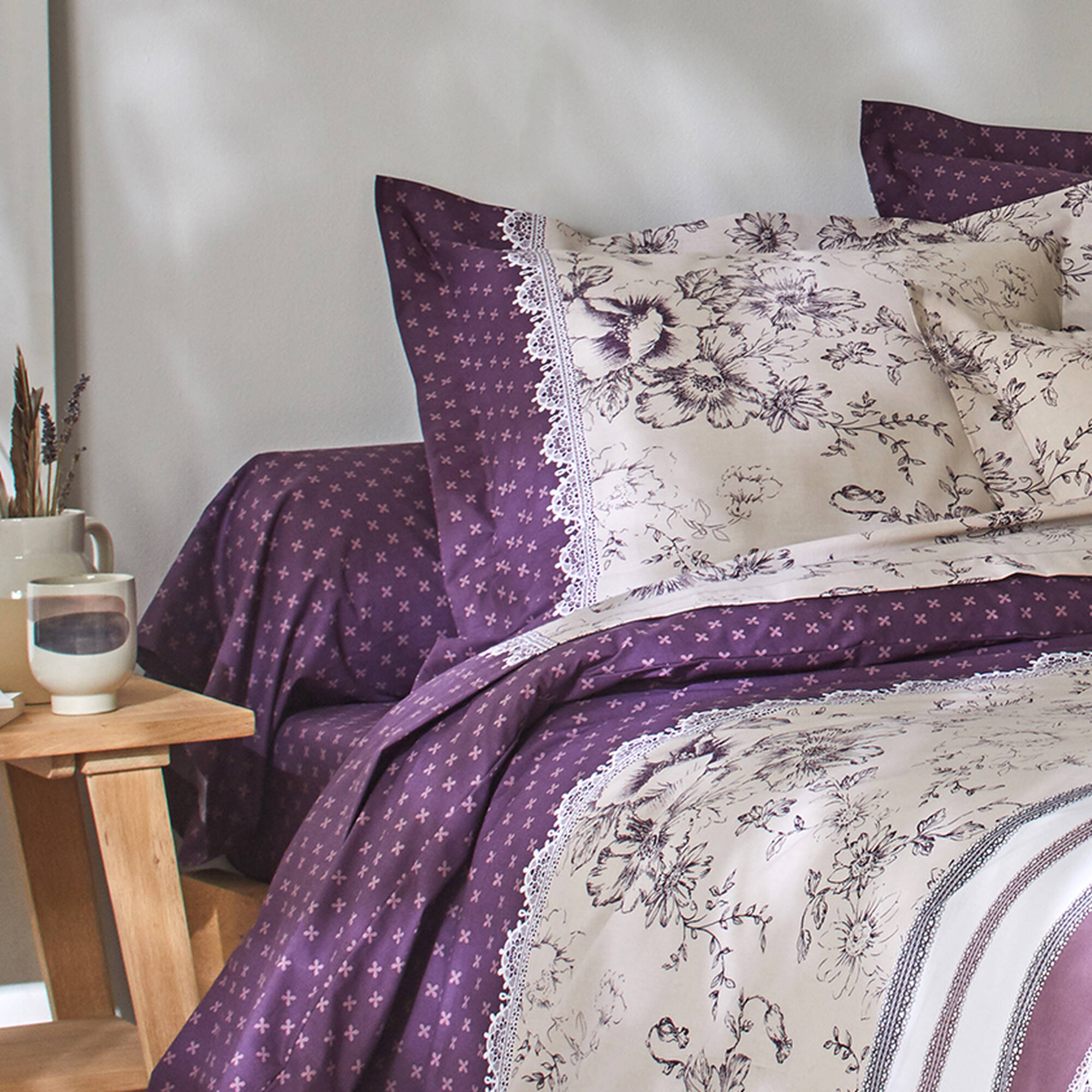 Linge de lit Gabrielle flanelle, imprimé fleurs et dentelle (prune)