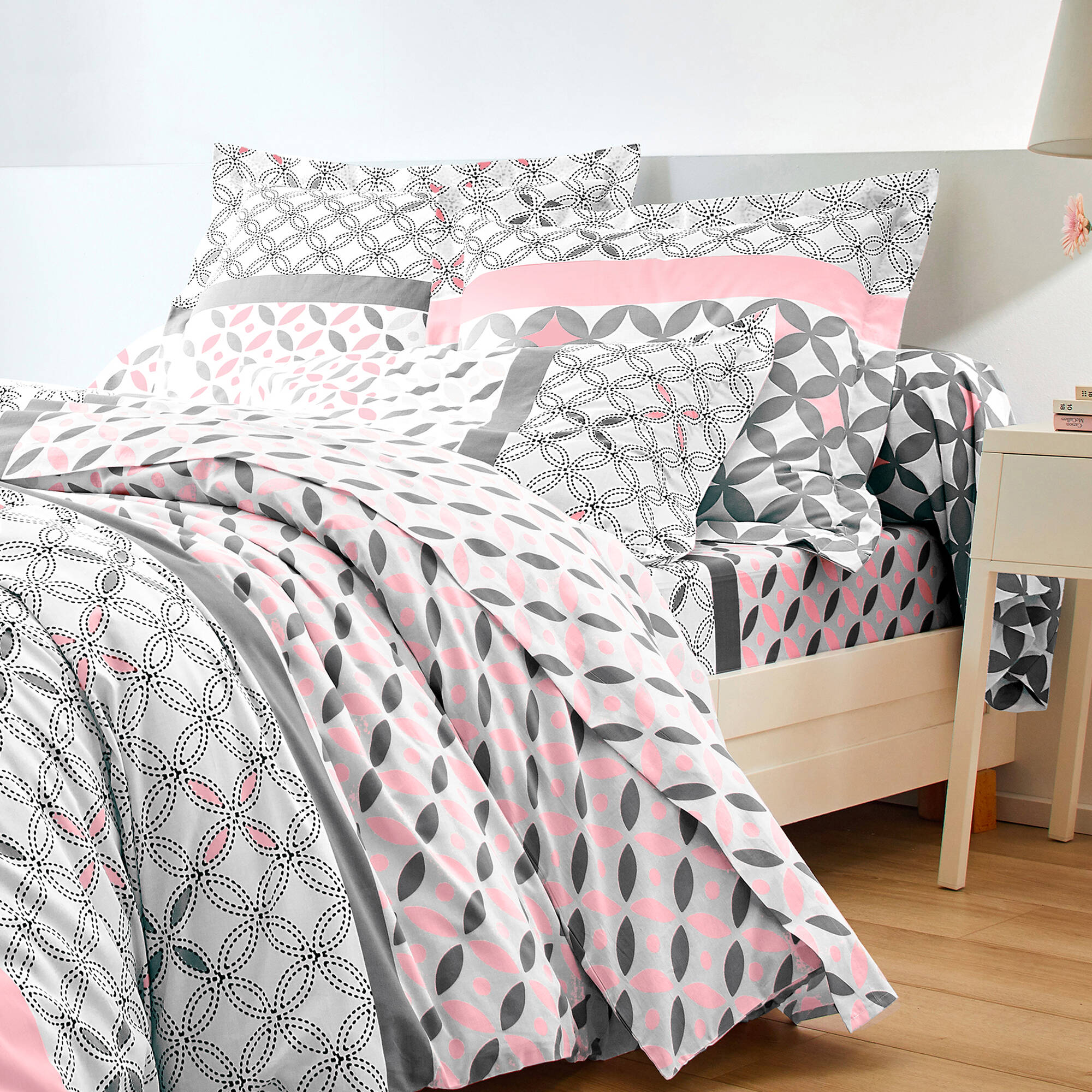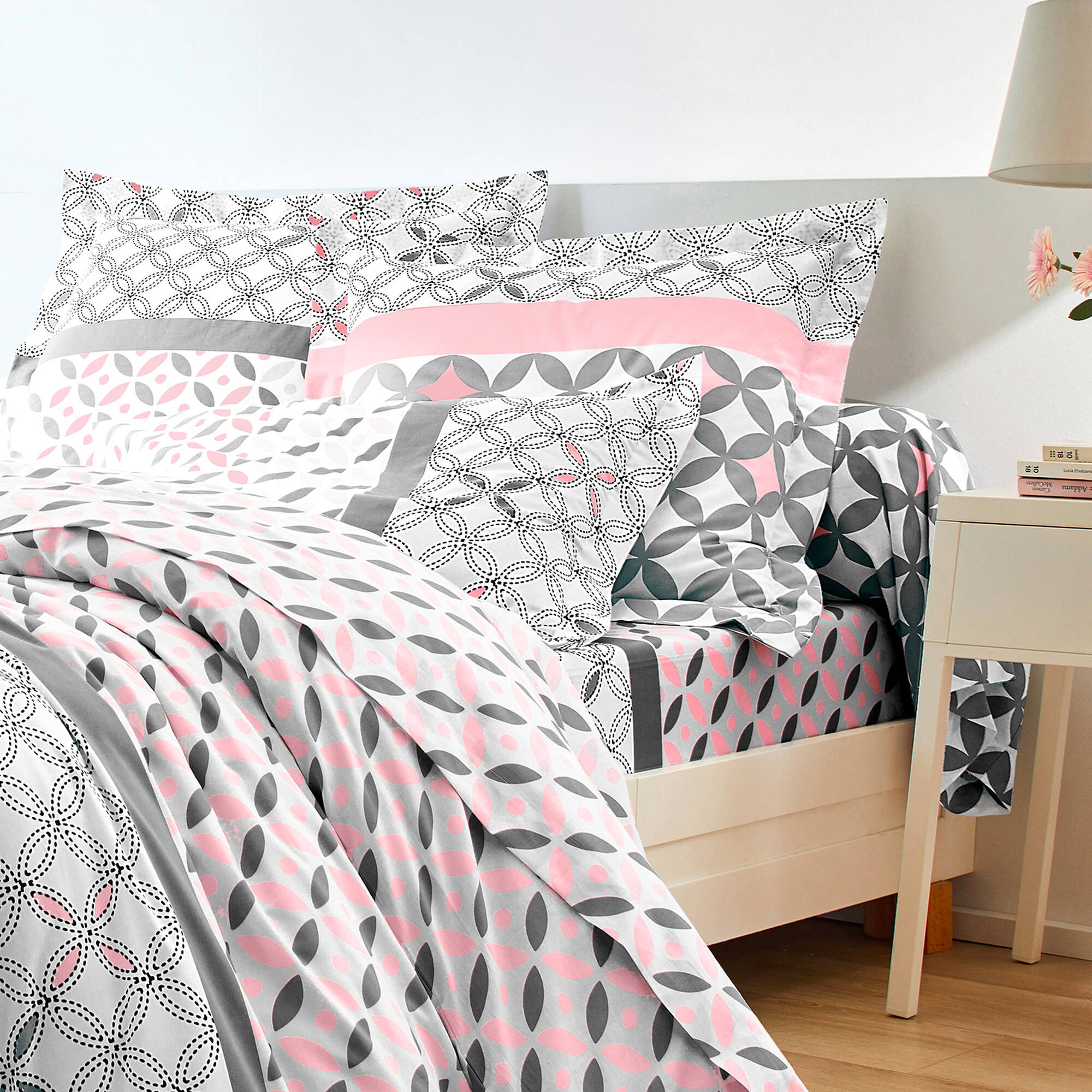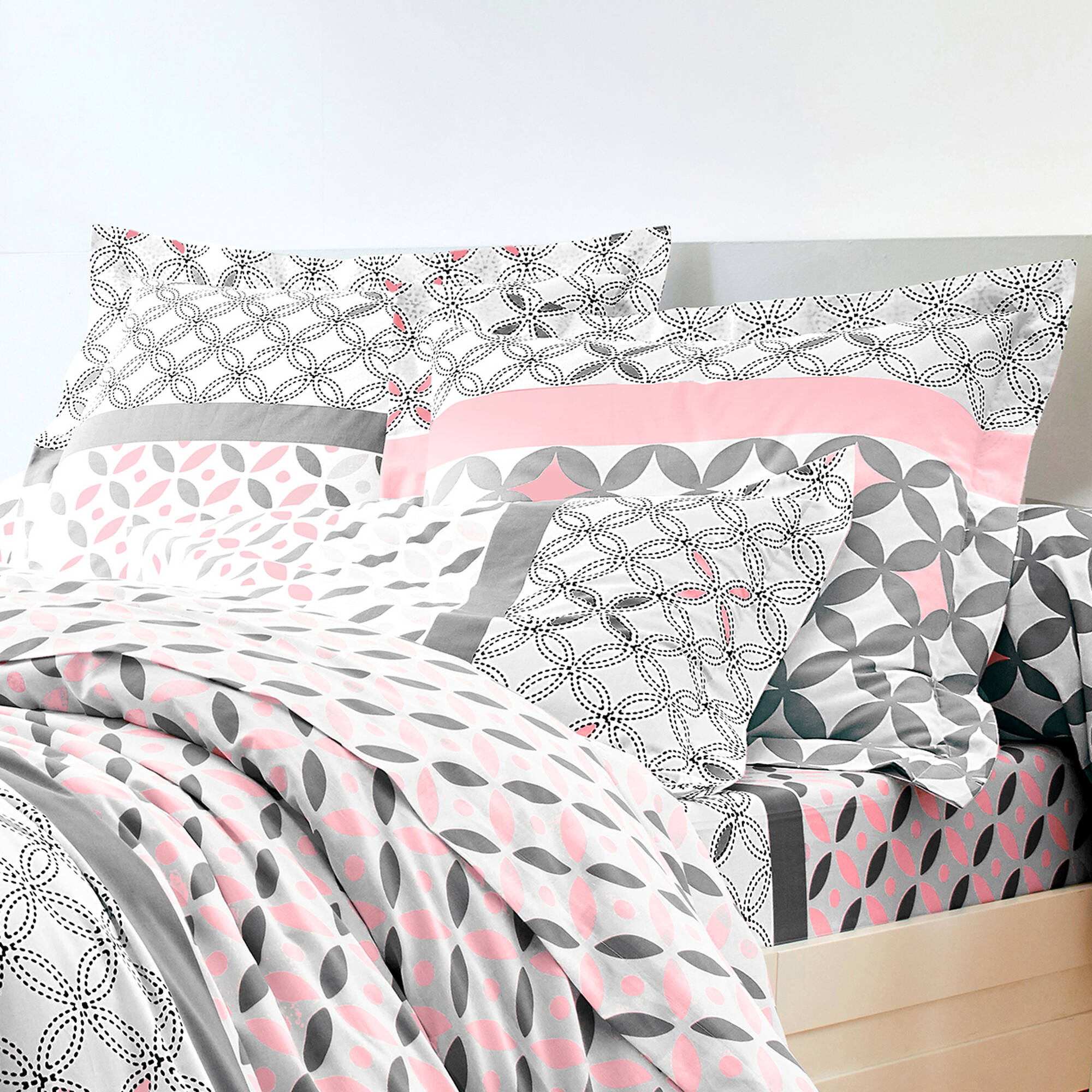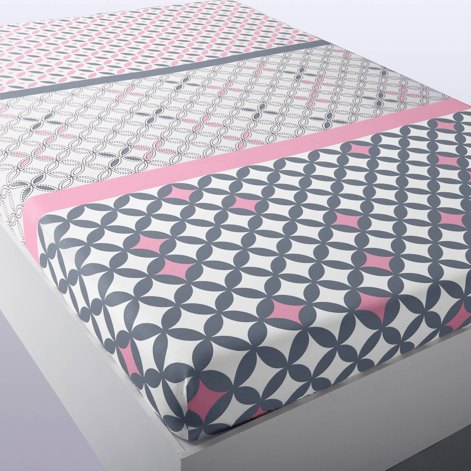 Linge de lit Marlow en coton motifs géométriques (gris / rose)