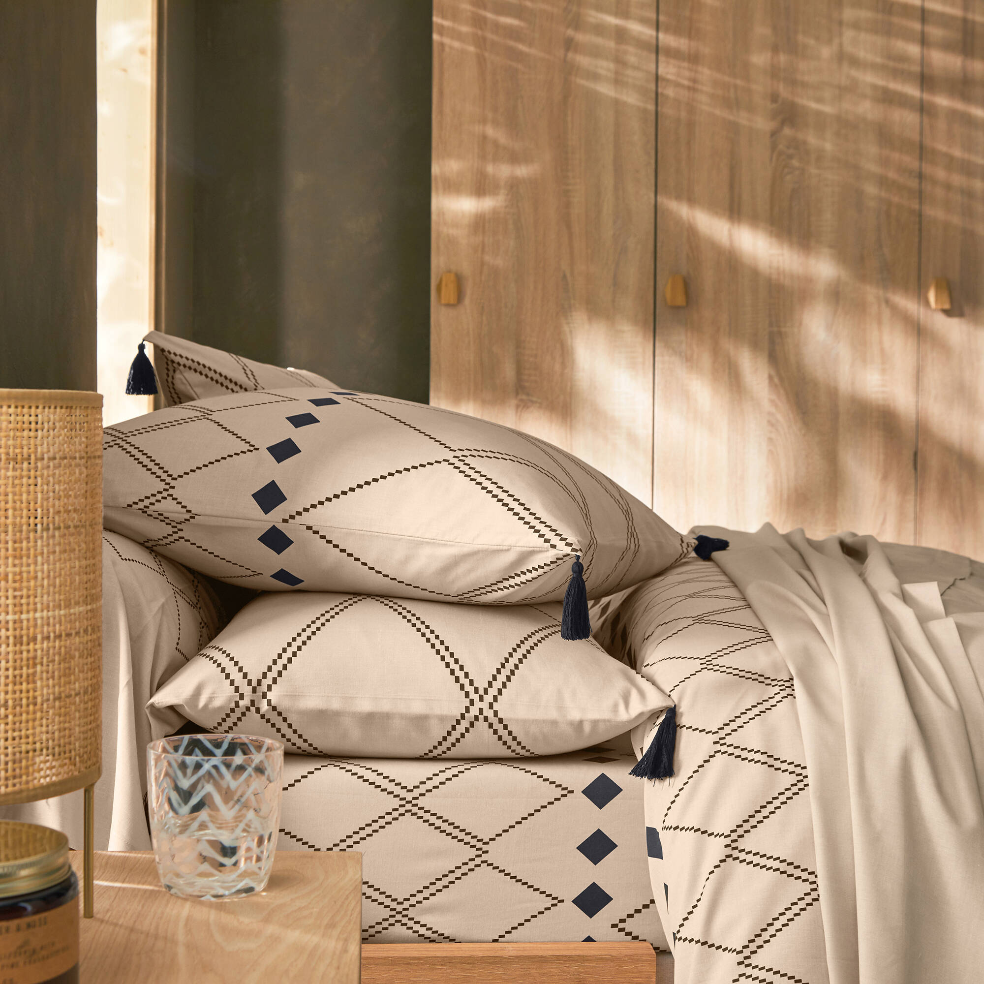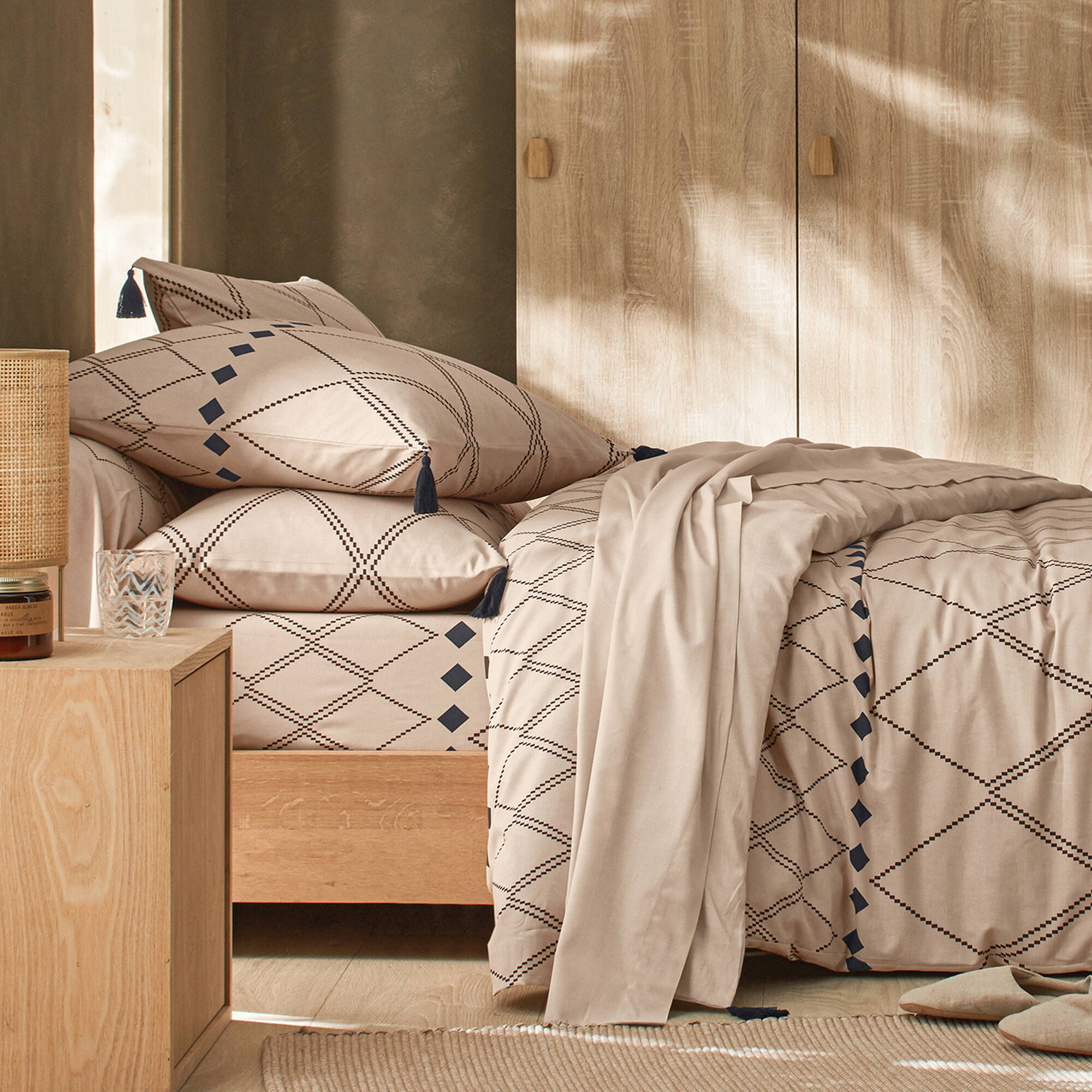Linge de lit Massaï coton à motifs graphiques et finitions pompons (beige)