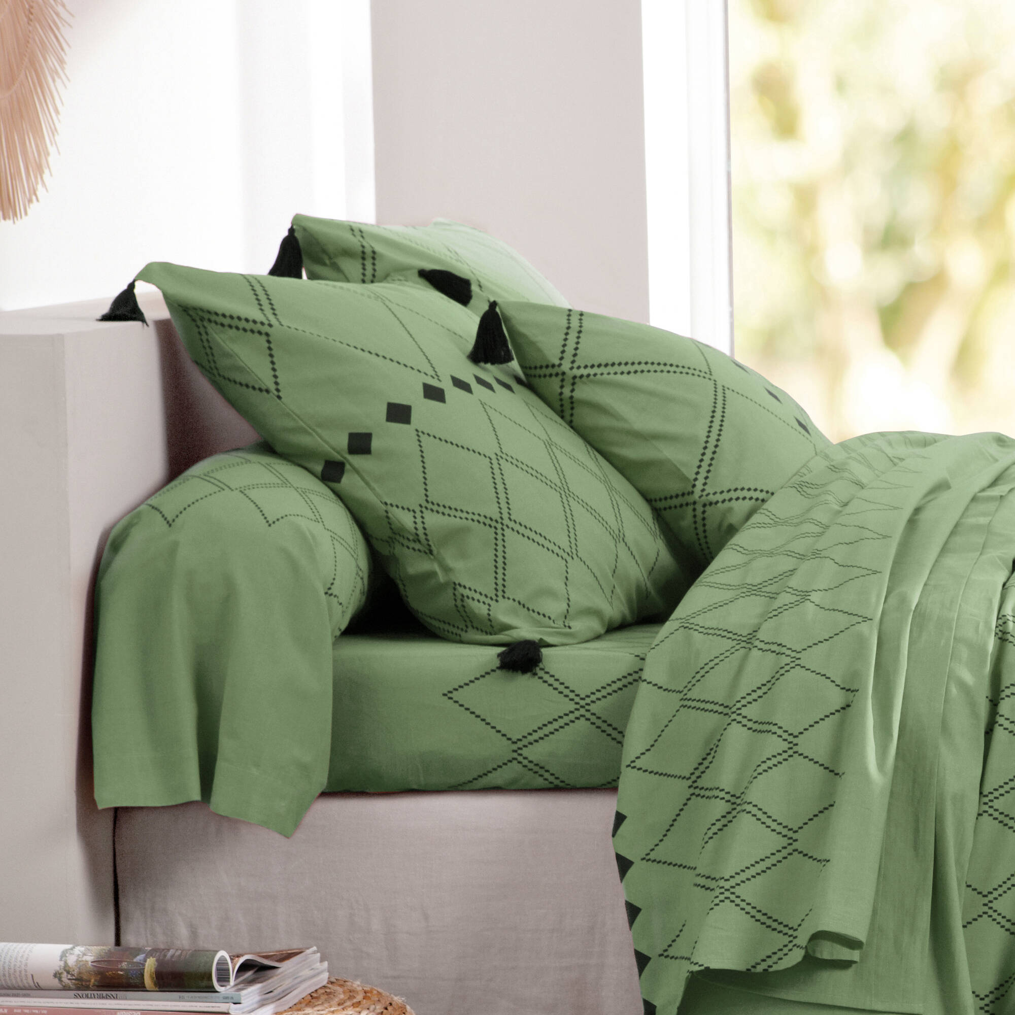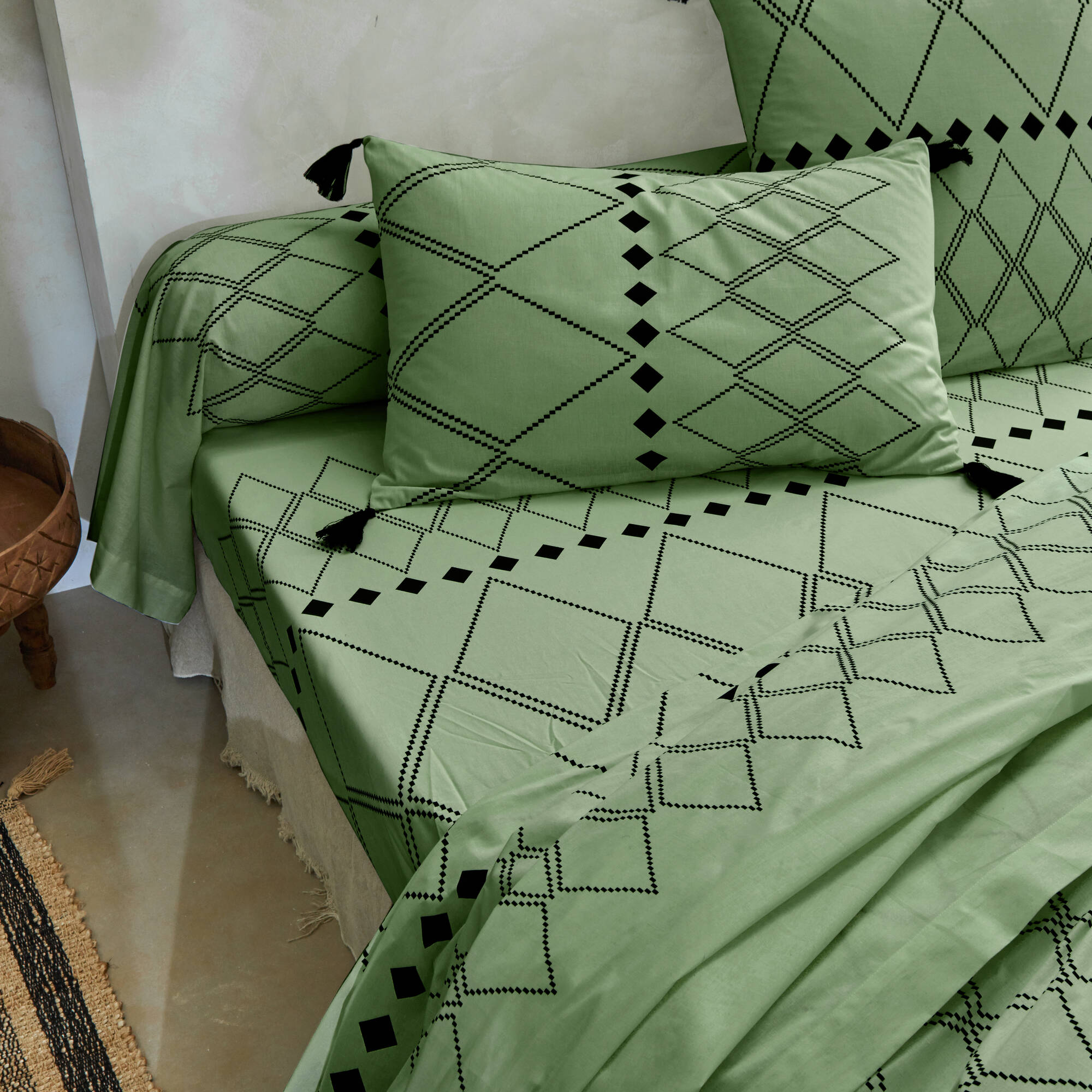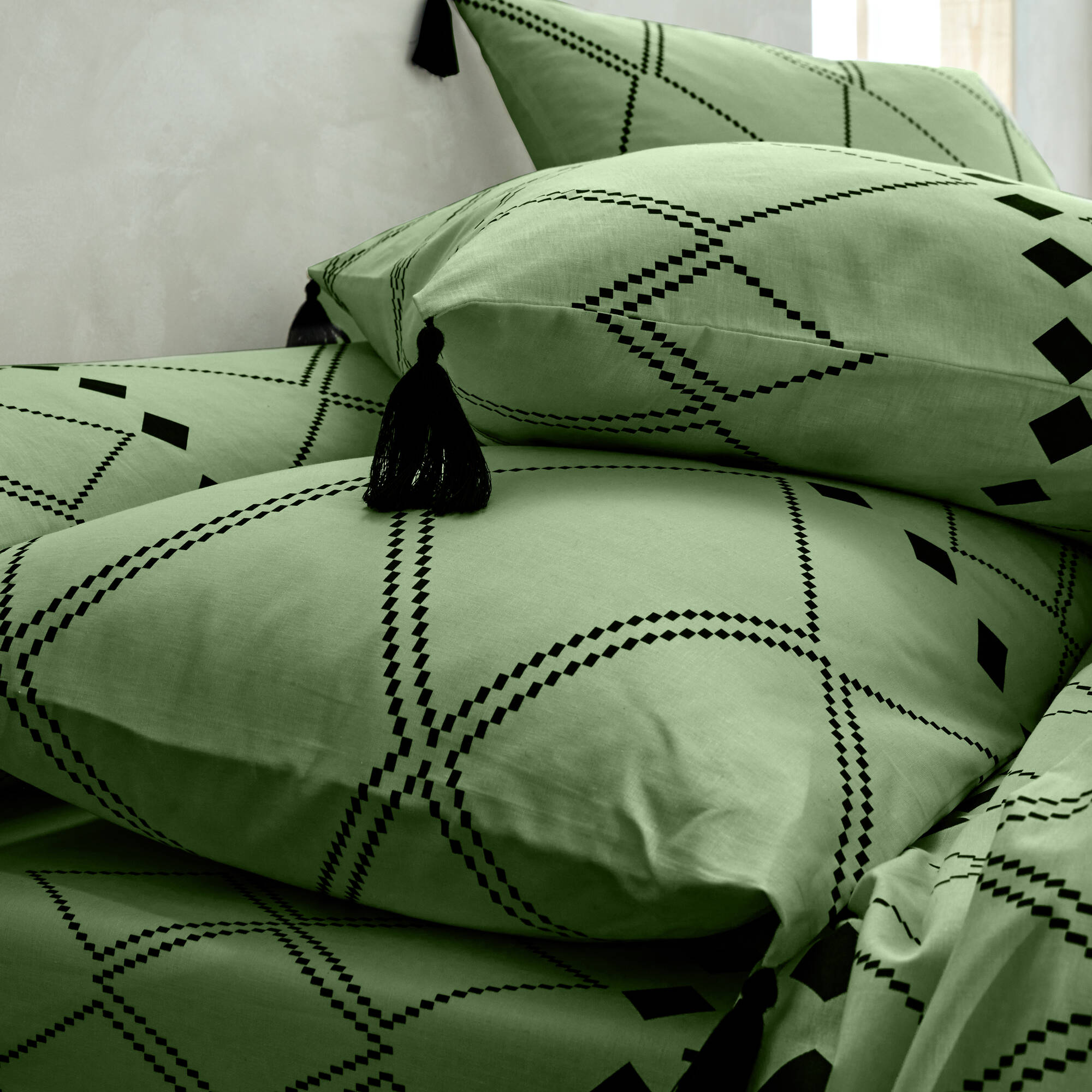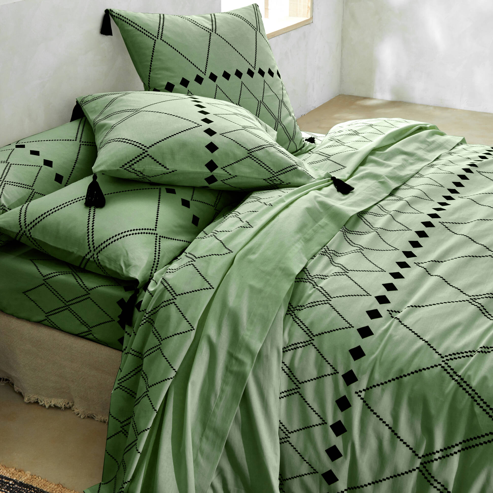 Linge de lit Massaï coton à motifs graphiques et finitions pompons (vert olive)