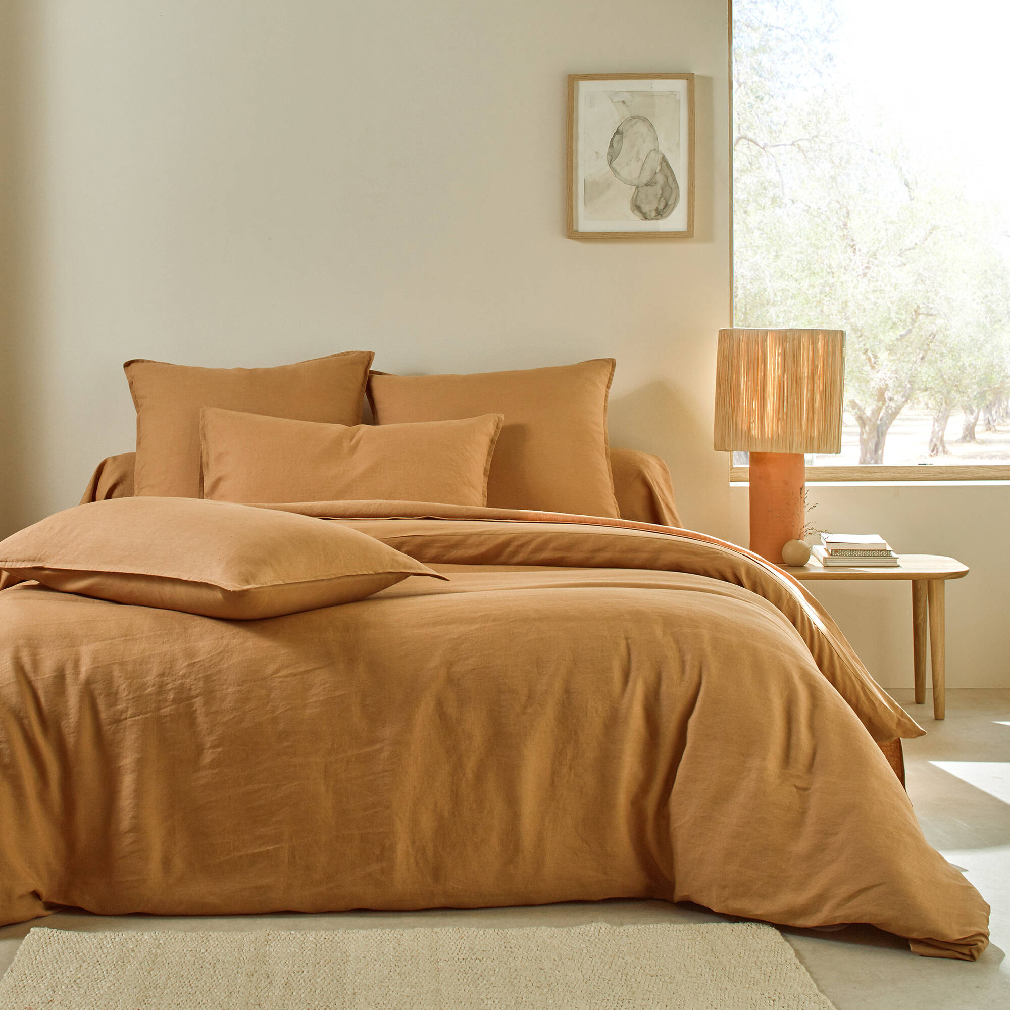 Linge de lit uni biface lin lavé / coton lavé  (noisette)