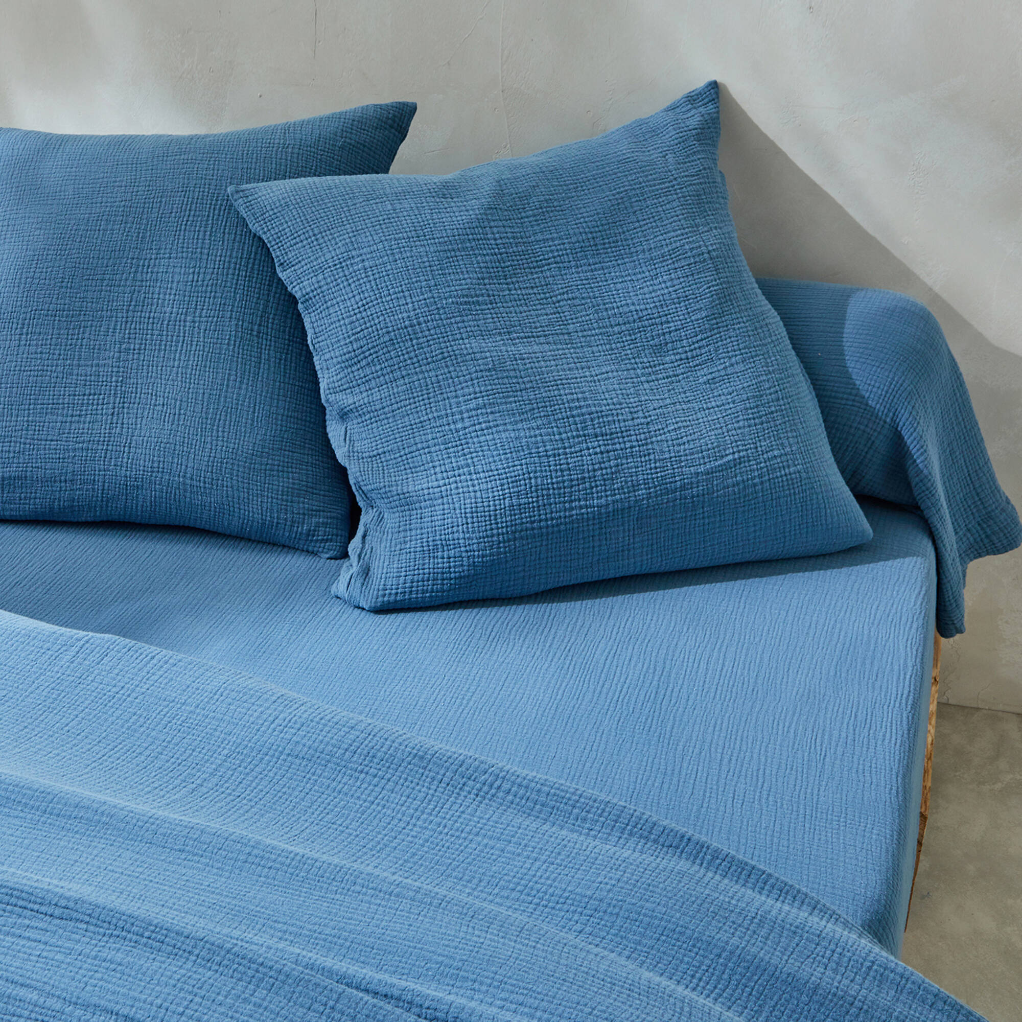 Linge de lit uni en triple gaze de coton (bleu)